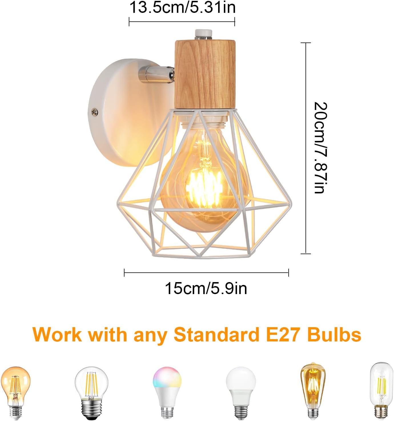 Dotata di attacco standard E27, è compatibile con la maggior parte delle lampadine LED, Edison o a incandescenza fino a 60W (lampadina non inclusa). Supporta anche lampadine dimmerabili se usata con interruttore dimmer (non incluso).
