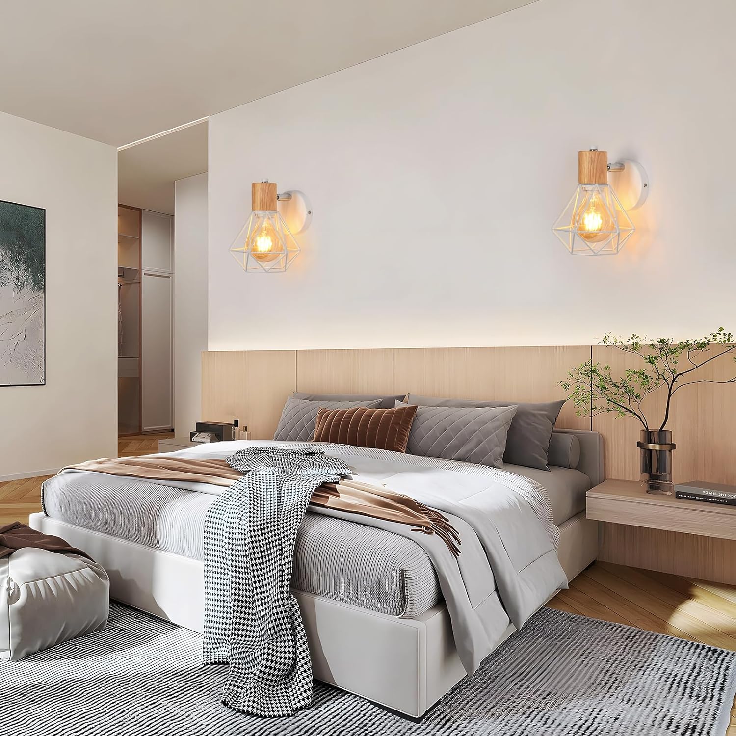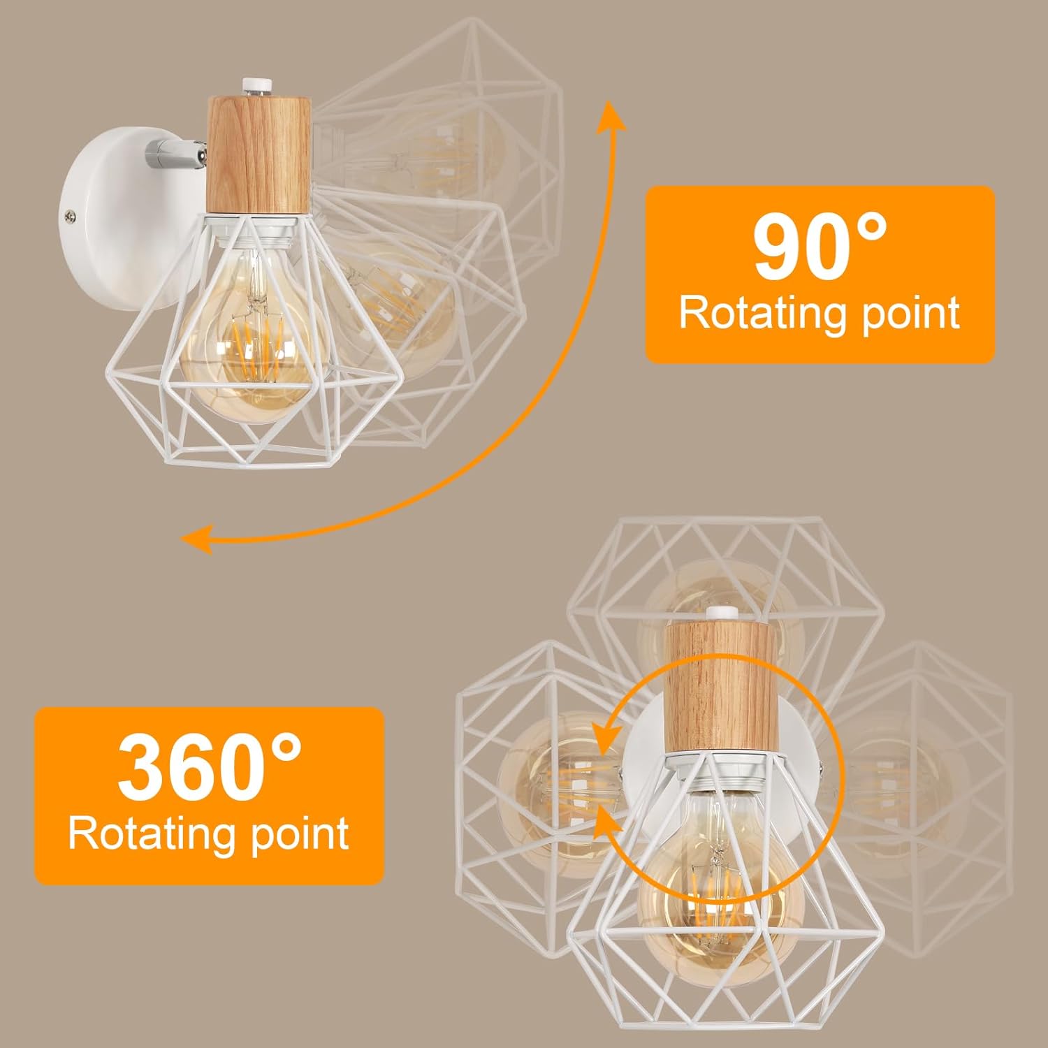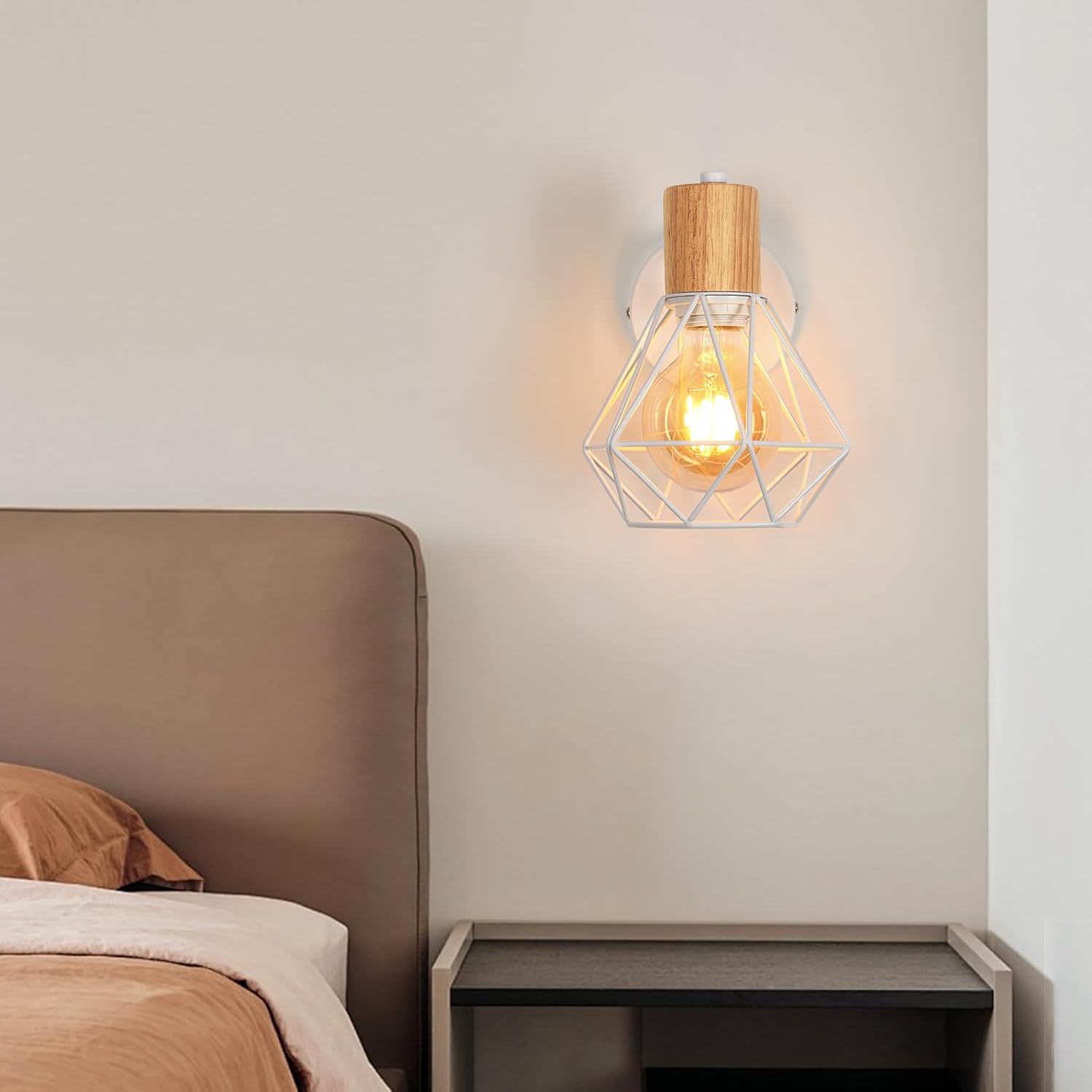 Lampada da Parete Vintage con Paralume a Gabbia Bianca e Base in Legno – Stile Industriale per Interni